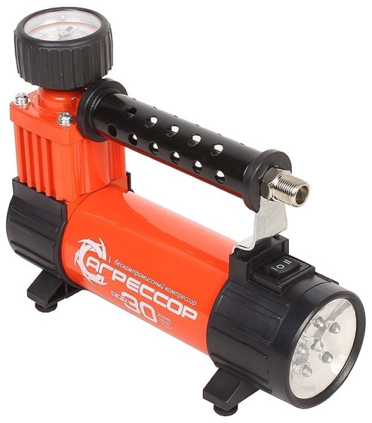 Компрессор воздушный АГРЕССОР, 30 л./мин., 12V/10A, 140W, 7 Атм., съёмный шланг 1 м., питание от прикуривателя, LED фонарь, набор из 4-х переходников для надувн. изделий, сумка