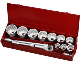 Набор головок 1" (36,41,46,50,55,60,65,70,75,80 мм.) 12-гранных,вороток,удлинители,трещотка 14 пр. в металлическом кейсе